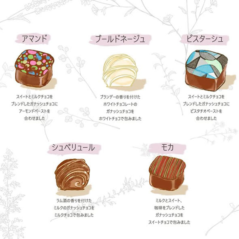 なめらかな口溶けのガナッシュチョコレートを、スイートやミルクチョコレートで包んでいます。