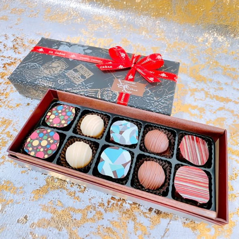世界のパティシエから愛されるヴァローナ社のチョコレートを使用したくりーむの手作りトリュフチョコレート、5種類を各2個ずつお箱に入れた詰め合わせ。